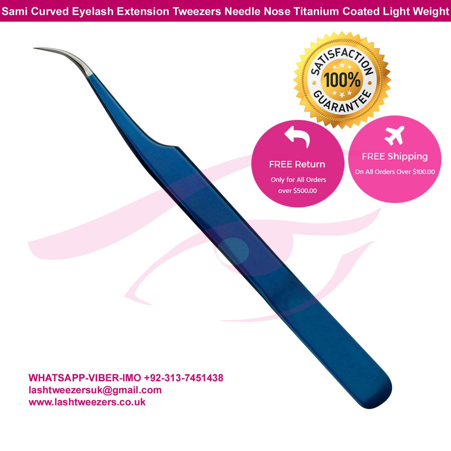 - Sami Curved Eyelash Extension Tweezers Needle Nose Titanium Coated Light Weight